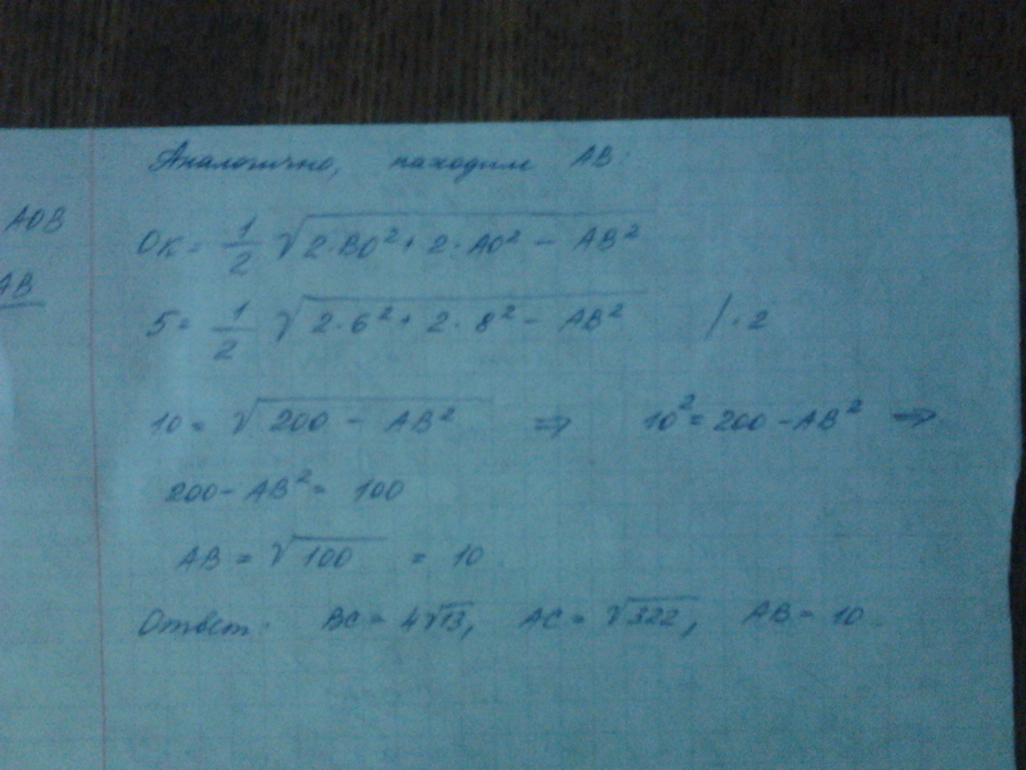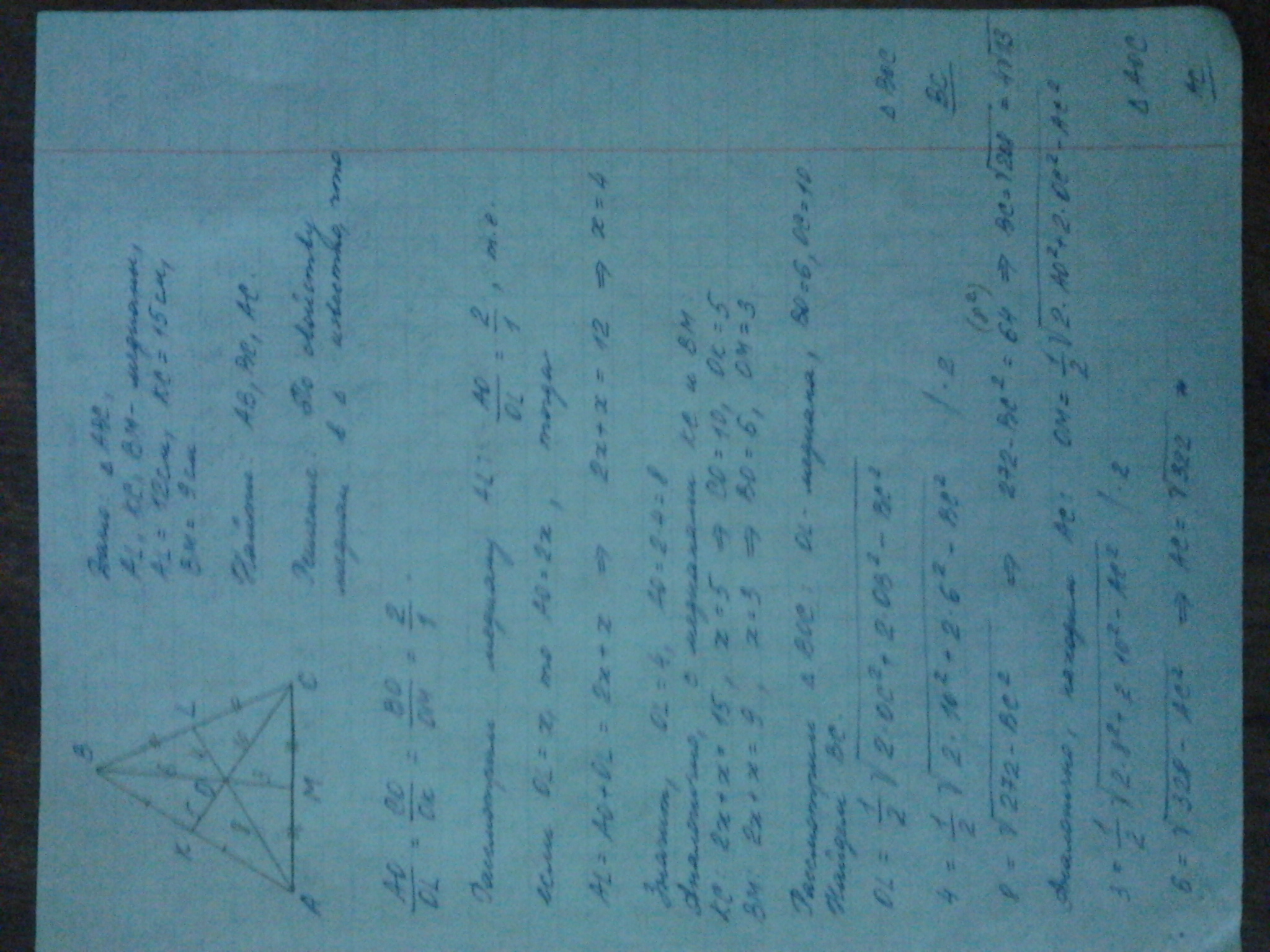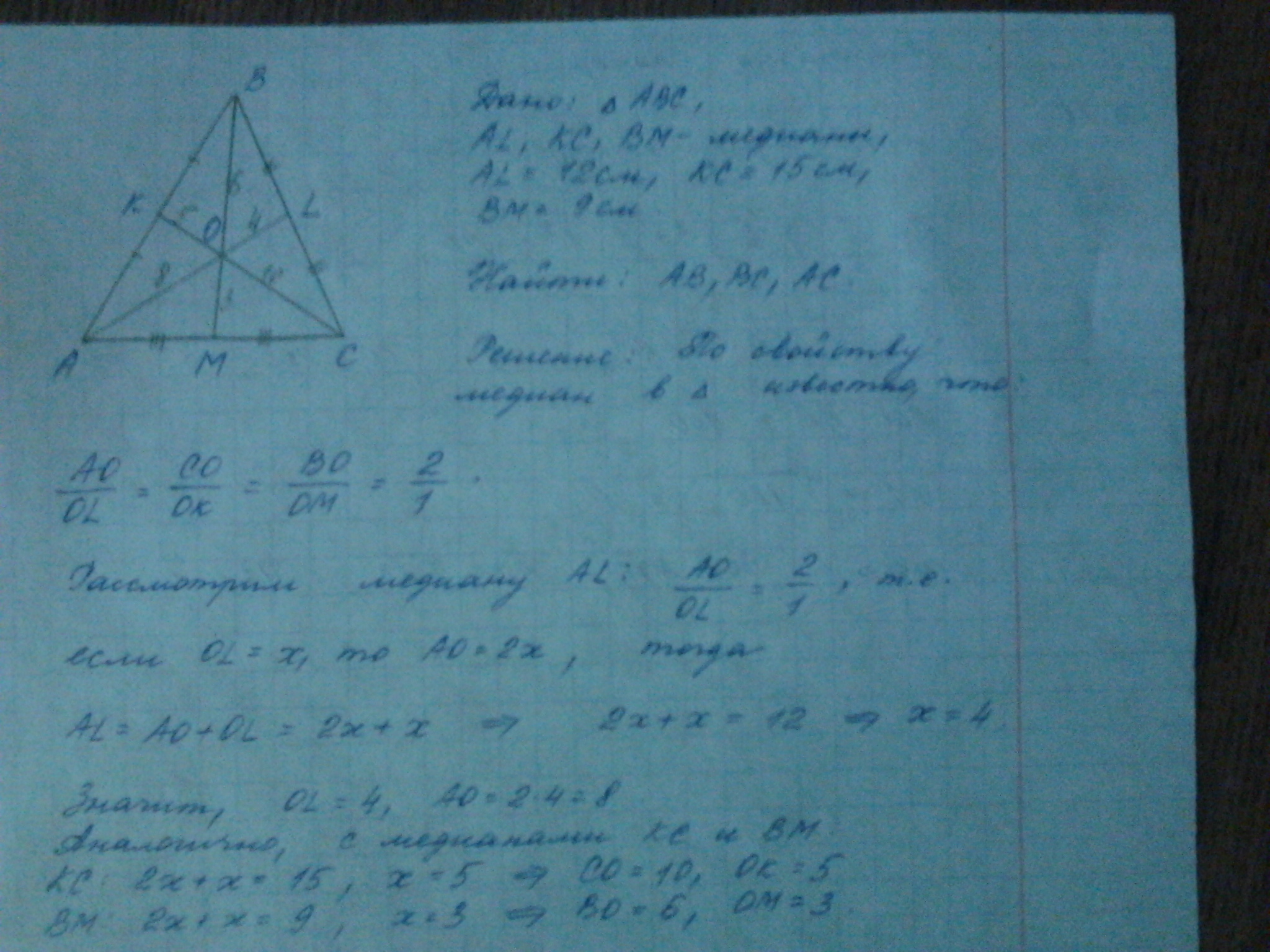 Медианы треугольника АВС равны 12 см, 15 см, 9 см.Найдите хотя бы одну сторону треугольника.