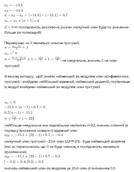 В такому випадку, щоб знайти найменший за модулем член арифметичнох прогресії - знайдемо найбільший відємний, найменший додатній, порівнявши їх модулі знайдемо найменший за модулем член прогресії