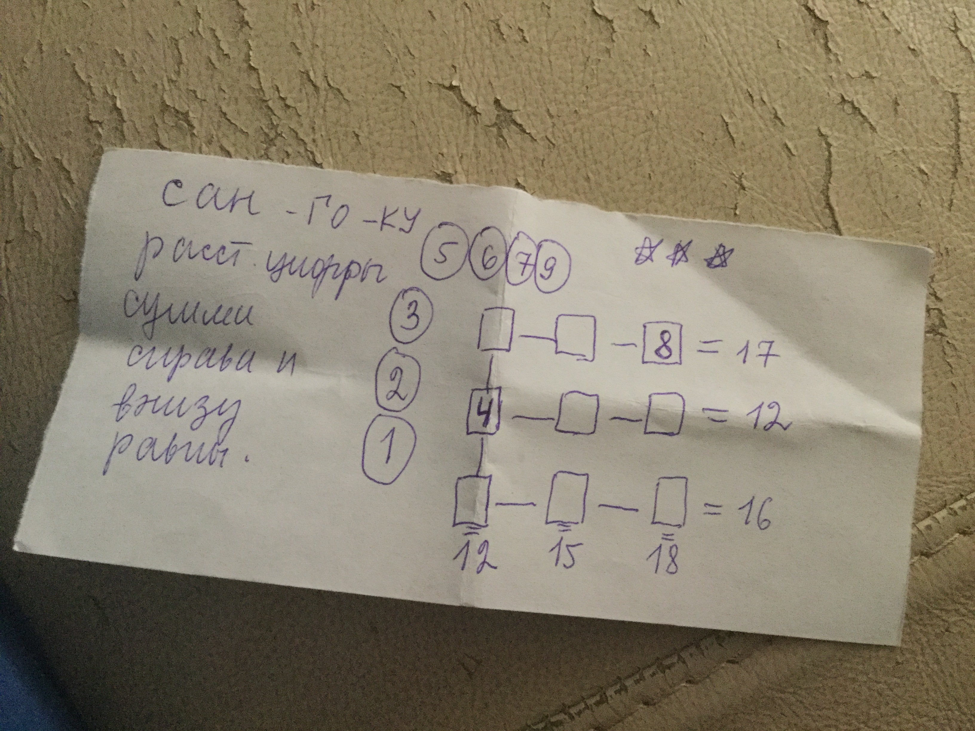 Нужно расставить цифры так, чтобы по вертикали и горизонтали получались указанные суммы. Заранее спасибо!