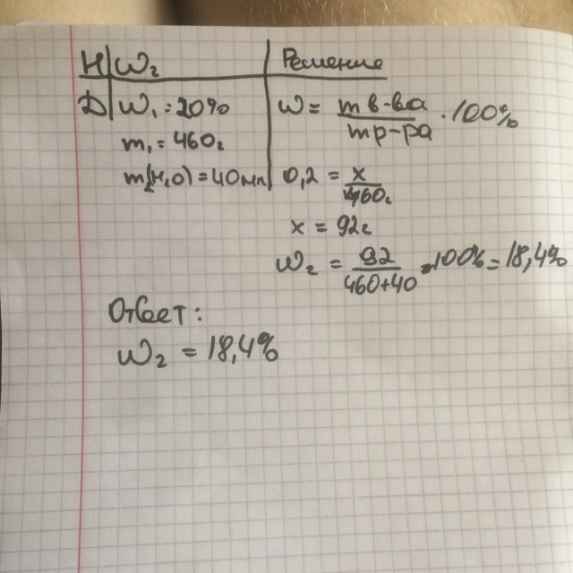 К 460г 20% раствора сахара добавили 40мл воды,опредилите массовую долю расстворённого вещества в полученном расстворе