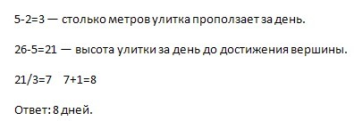 Улитка за день заползает вверх по дереву на 5 м, а за ночь сползает на 2 м. Высота дерева 26 м. За сколько дней улитка доползёт от основания до вершины дерева?