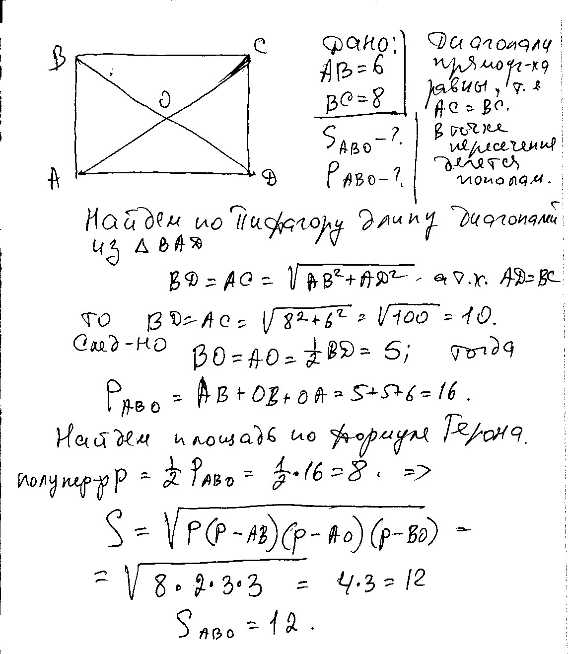 Дан прямоугольник ABCD,где BC=8,BA=6 найти Sabo,Pabo, если О - точка пересечения диагоналей.