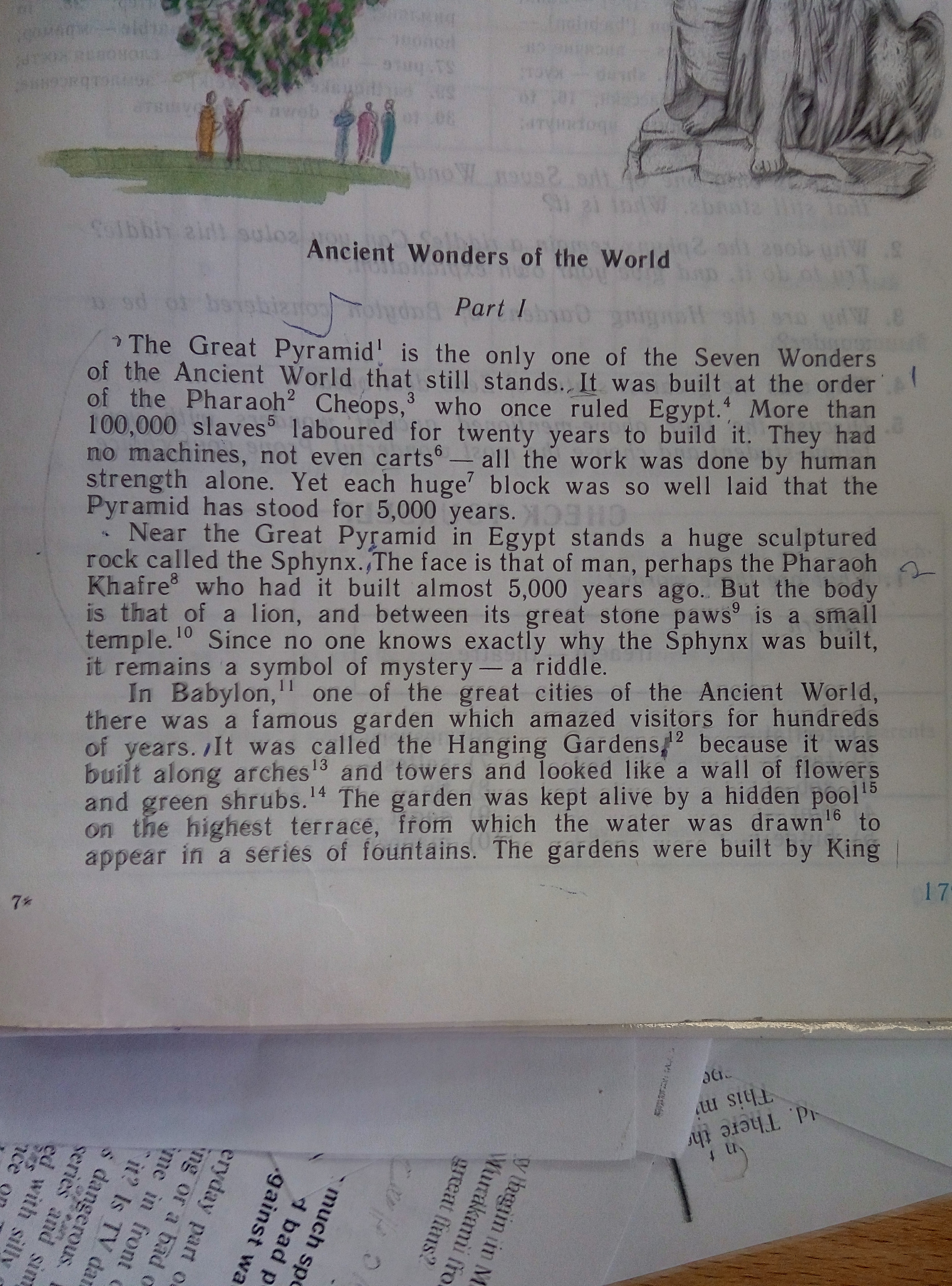 Великая Пирамида - единственная из Семи Чудес Древнего Мира, которая всё еще существует. Она была построена по приказу Фараона Хеопса, который однажды правил Египтом. Более чем 100.000 рабов трудились в течение 20 лет, чтобы её построить. У них не было машин, даже повозок - всё было построено человеческим трудом. И каждый огромный блок был настолько правильно установлен, что Пирамида стоит уже 5000 лет.