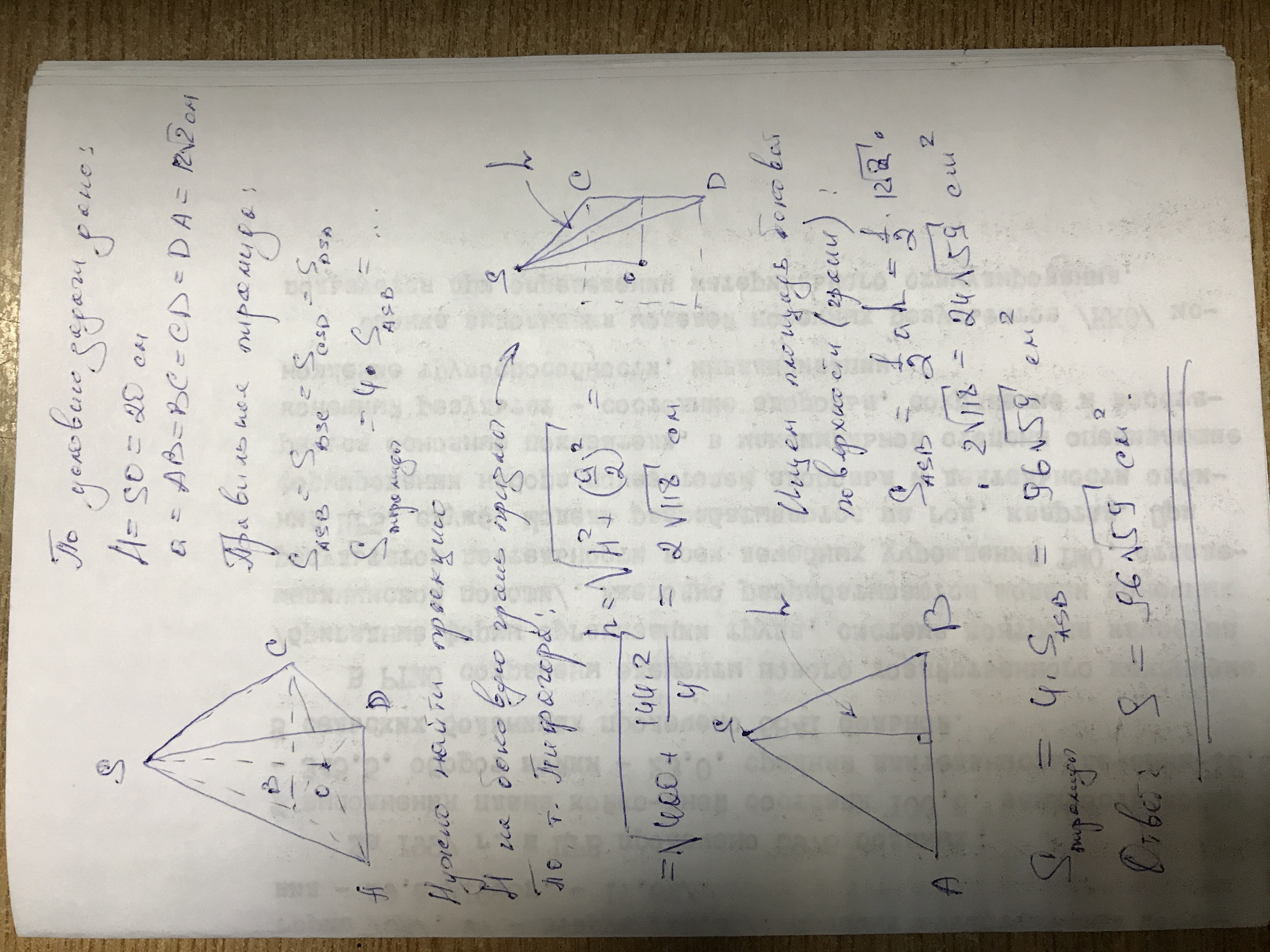 Высота правильной четырехугольной пирамиды равна 20 см, а сторона основания 12корень2 см. Найдите площадь боковой поверхности пирамиды