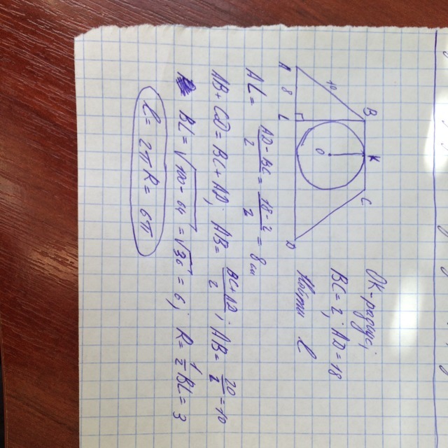В равнобедренную трапецию с основаниями 2 см и 18 см вписана окружность. Найдите длину окружности, описанной около этой трапеции