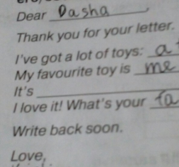 дорогая Даша, спасибо за твое письмо. у меня есть много игрушек. мои любимые игрушки. это. я люблю это. это твой.. напиши мне потом.