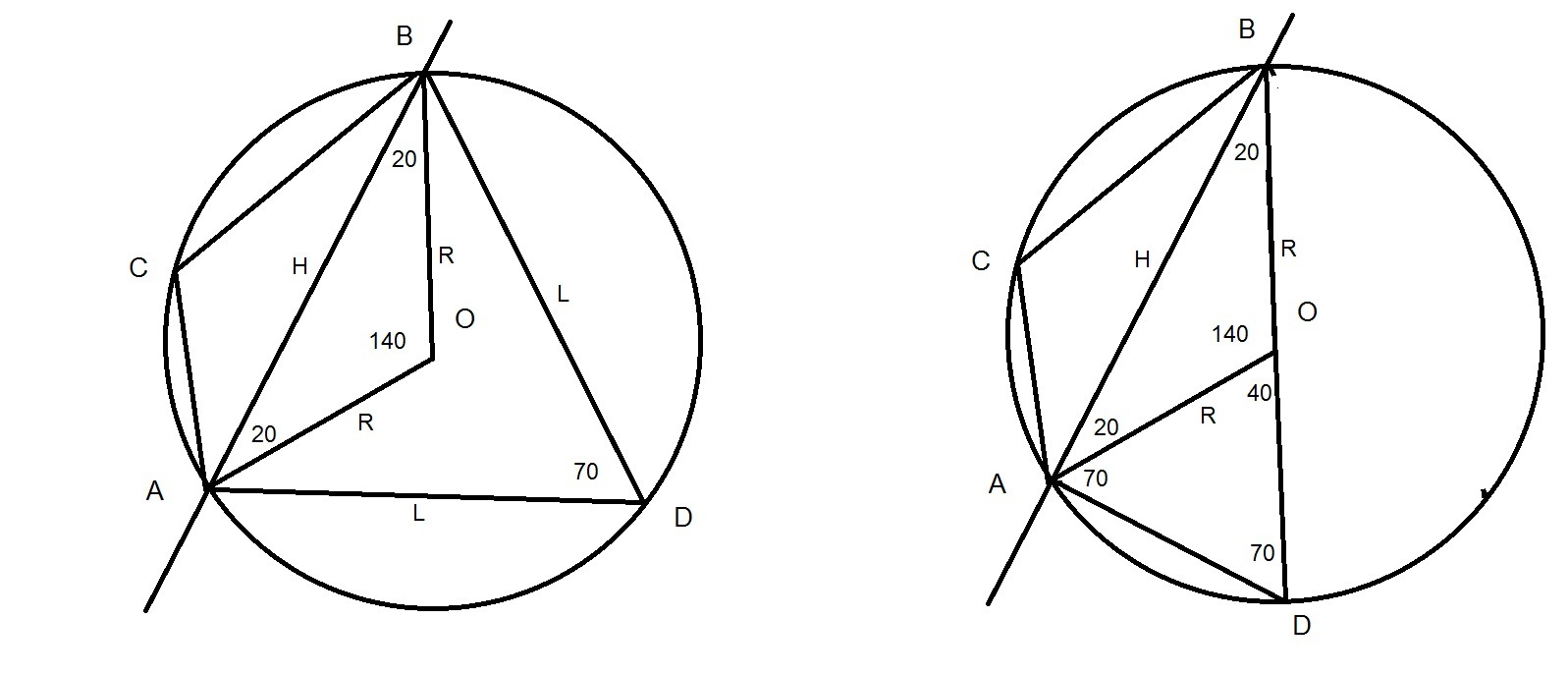 Опять же, есть свойство, что как бы мы ни двигали точку D (см. рисунки), внутренний угол останется неизменным. Ничто не мешает нам передвинуть её таким образом, чтобы одна из образующих этого угла прошла через центр окружности - точку O (см. правый рисунок). Тогда можно утверждать, что угол BAD - прямой (опирается на диаметр) и равен 90 градусов. Зная, что AO и BO равны (это ведь радиусы) и что AOB равен 140 градусов, получим, что BAO и ABO равны (180 - 140)/2=20 градусов каждый. Но это, в общем-то, лишний шаг, так как AOD равен 180 - AOB = 40, AO = OD и следовательно OAD = ODA = (180 - 40)/2 = 70