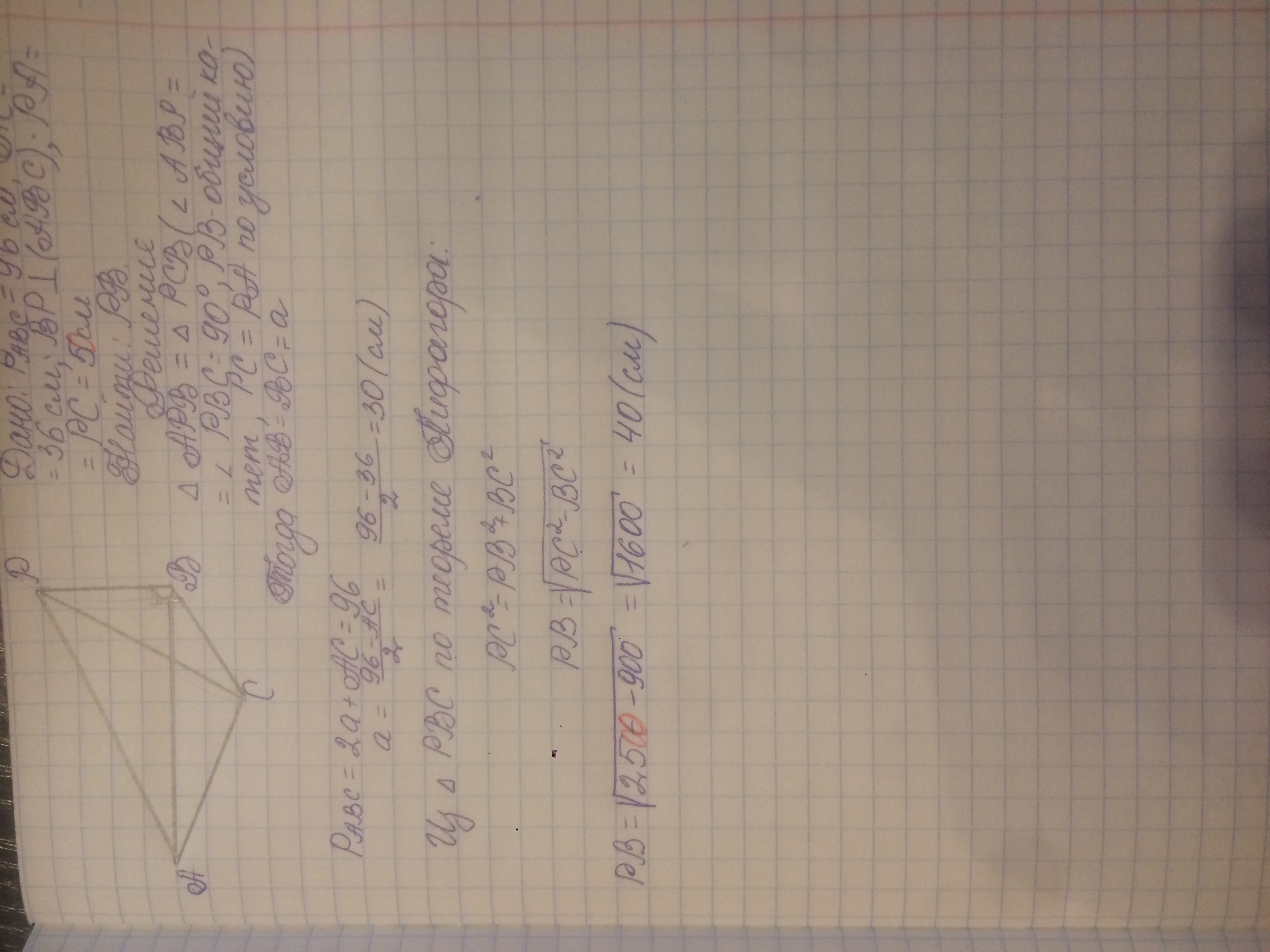Периметр треугольника равен 96 см, AC=36см. Через вершину B проведен перепендикуляр BP к плоскости треугольника, PA=PC=5см. Найти расстояние от точки Р до плоскости (АРС)