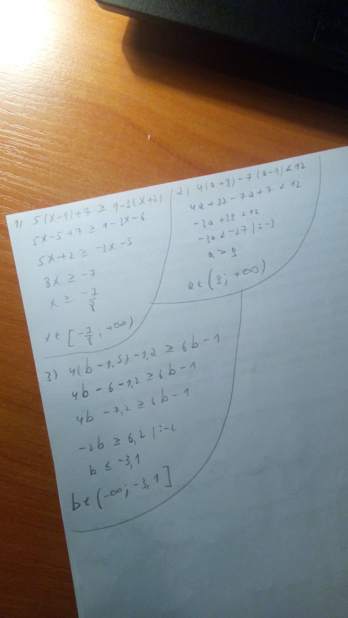 1) 5(x-1)+7больше или равно1-3(x+2)