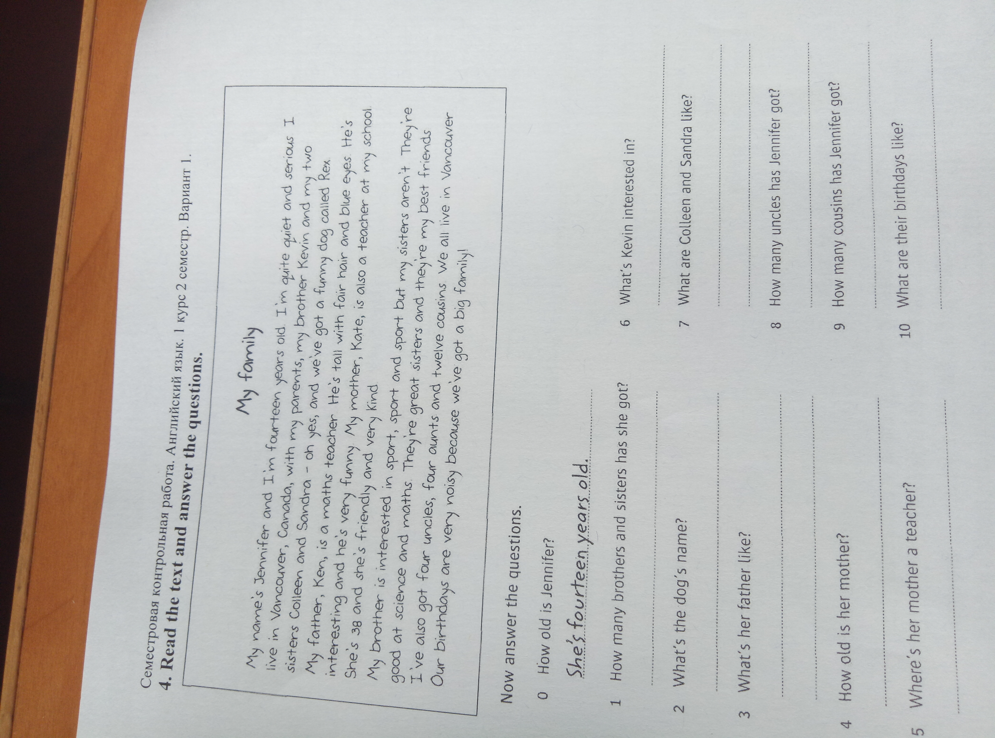 1She has got one brother and two sisters. 2The dog's name is Rex. 3Her brother is tall with fair hair and blue eyes. 4Her mother is thirty-eight. 5 Her mother is a teacher at Jennifer's school. 6Kevin is interested only in sport. 7They aren't sporty but they are good at science and maths. 8She has got four uncles. 9Jennifer has got twelve cousins. 10Their bithdays are very noisy.