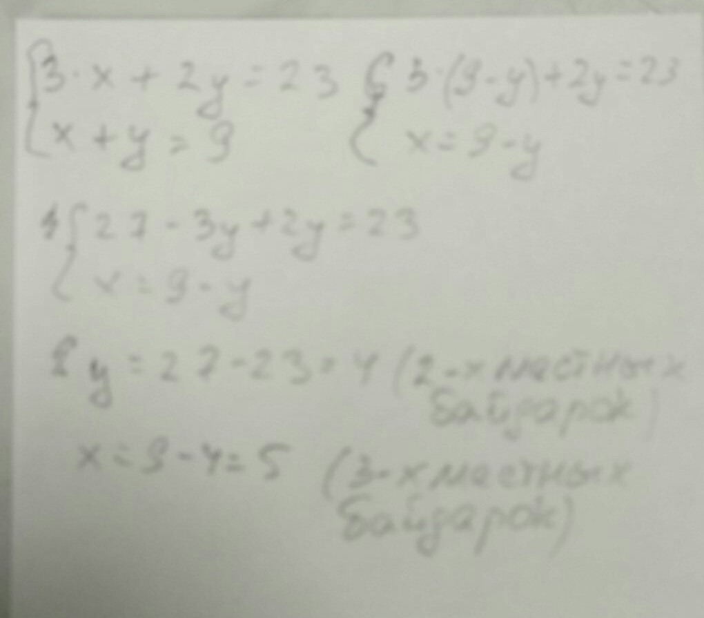 отряд туристов вышел в поход на 9 байдарках часть из которых- двухместные а часть- трёхместные.Сколько двухместных и сколько трёхместных байдарок в походе если отряд состоит из 23 человек