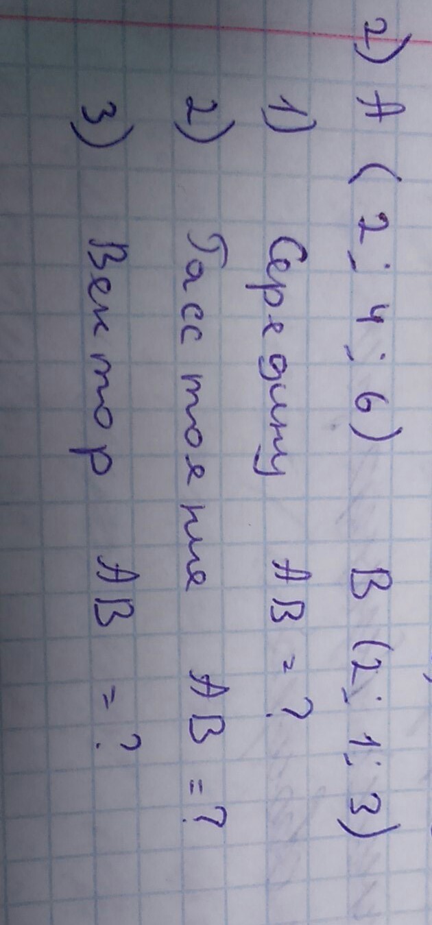 Середина отрезка АВ будет находиться в точке ((2+2)/2 ; (4+1)/2 ; (6+3)/2), или (2;2,5;4,5)