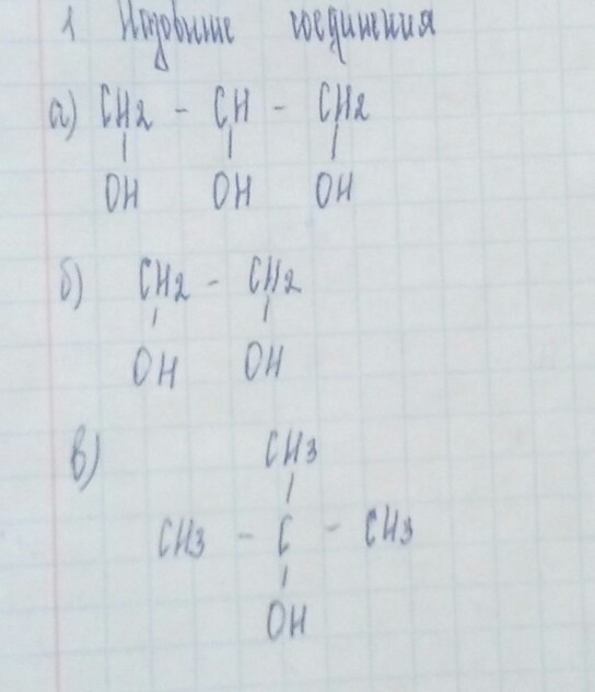 а) глицерин. Пропантриол. б) этиленгликоль. Этандиол. в)2метилпропанол2. а) и б) многоатомные спирты. в) одноатомный