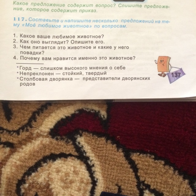 Моё любимое животное собака её зовут.....Она чёрная, красивая знает несколько команд (лежать,сидеть) .Он питается специальным кормом для собак .Я с детства хотел это животное и давно просил его у родителей и на День Рождения мне подарили этого друга.