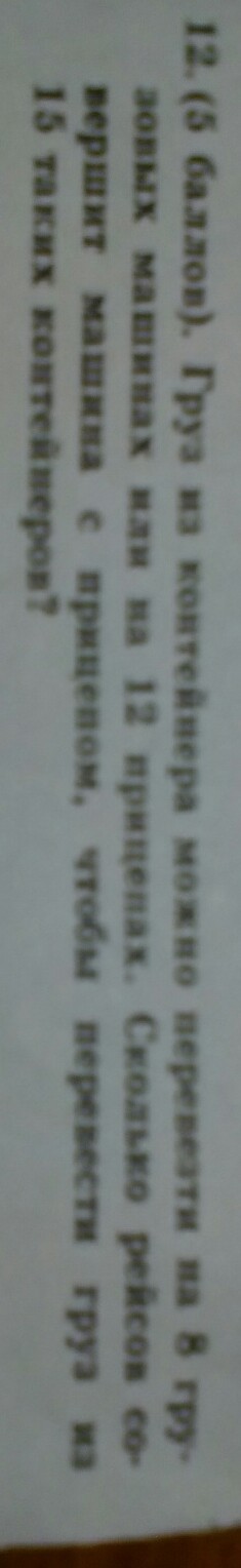 Груз из контейнера можно перевезти на 8 грузовых машинах или 12 прицепах. Сколько рейсов совершит машина с прицепом, чтобы перевезти груз из 15 таких контейнеров?