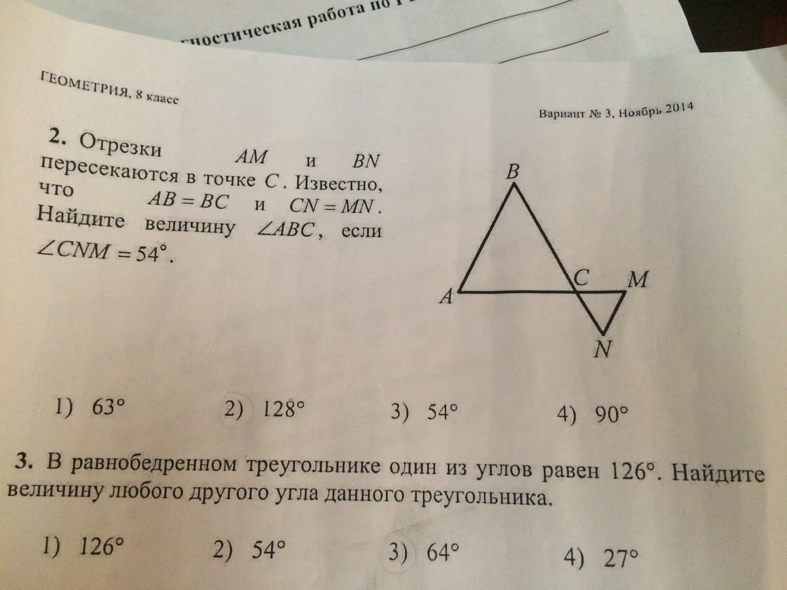 1.Отрезки AM и BN пересекаются в точке C. известно, что AB=BC и CN=MN. Найдите величину ∠ABC, если ∠CNM=54 градуса