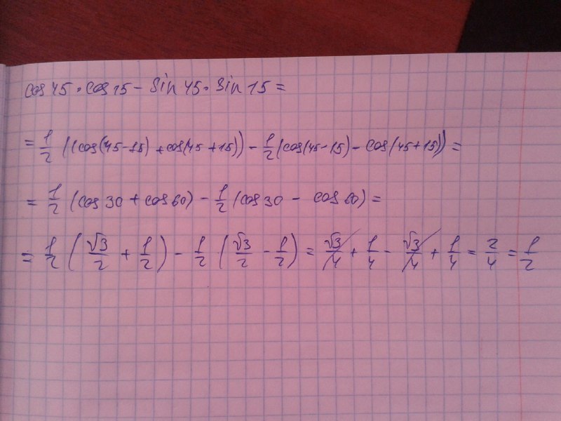 сos 45°*cos 15°-sin 45°*sin 15° = cos(45+15) = cos (60) = 1/2