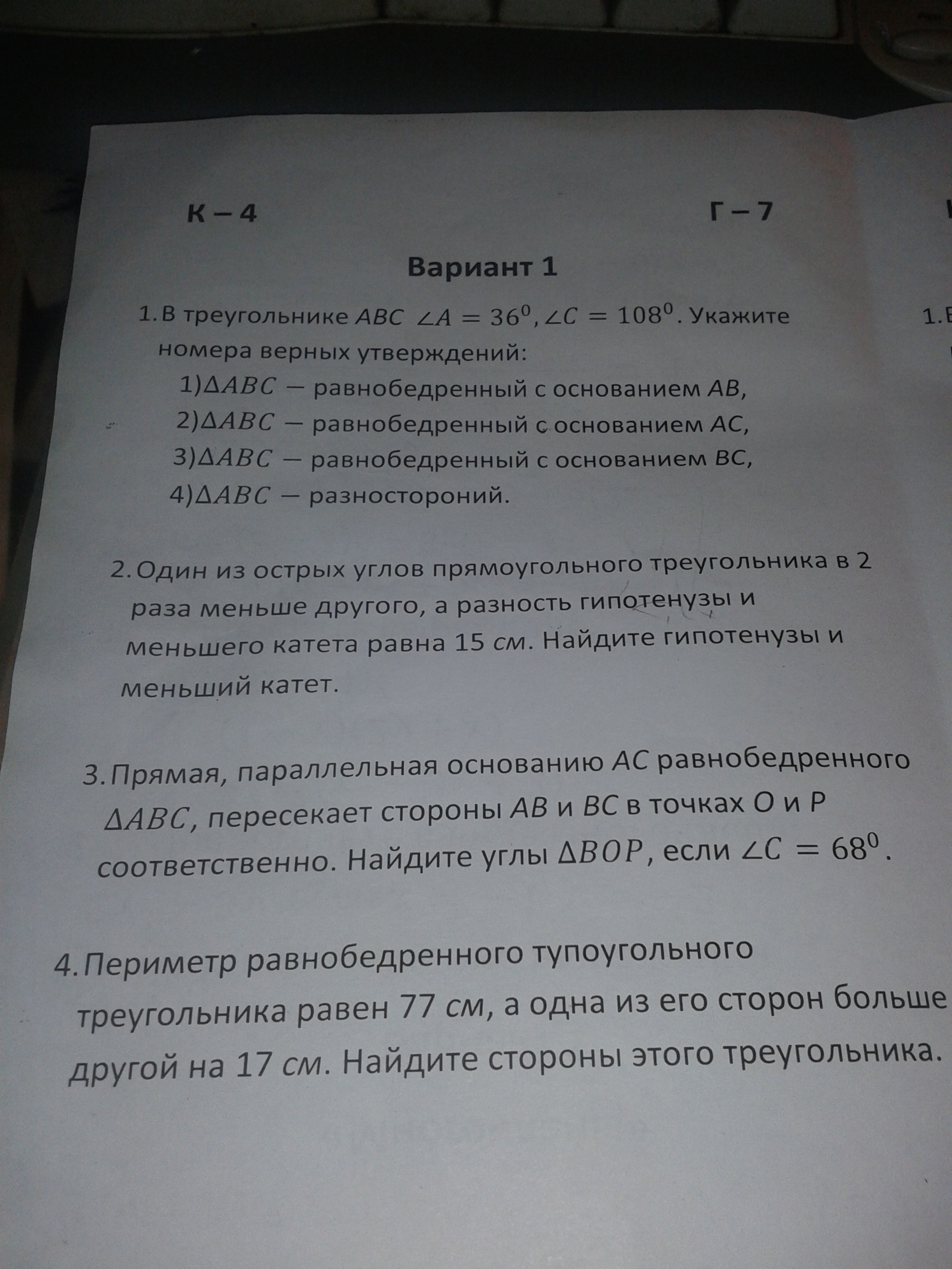 4)Тк в равнобедренном треугольнике боковые стороны равны , то обозначим их за Х , а последнюю сторону за У и дальше по тексту , периметр равен получается 2х+у=77 , а т.к сказано , что одна больше другой на 17 , то это явно про У , тк 2 стороны у него равны , значит большая равна у+17 . Получим уравнение 3х+17=77, неизвестные влево известные вправо получаем 3х=60 отсюда х = 20 это одна сторона