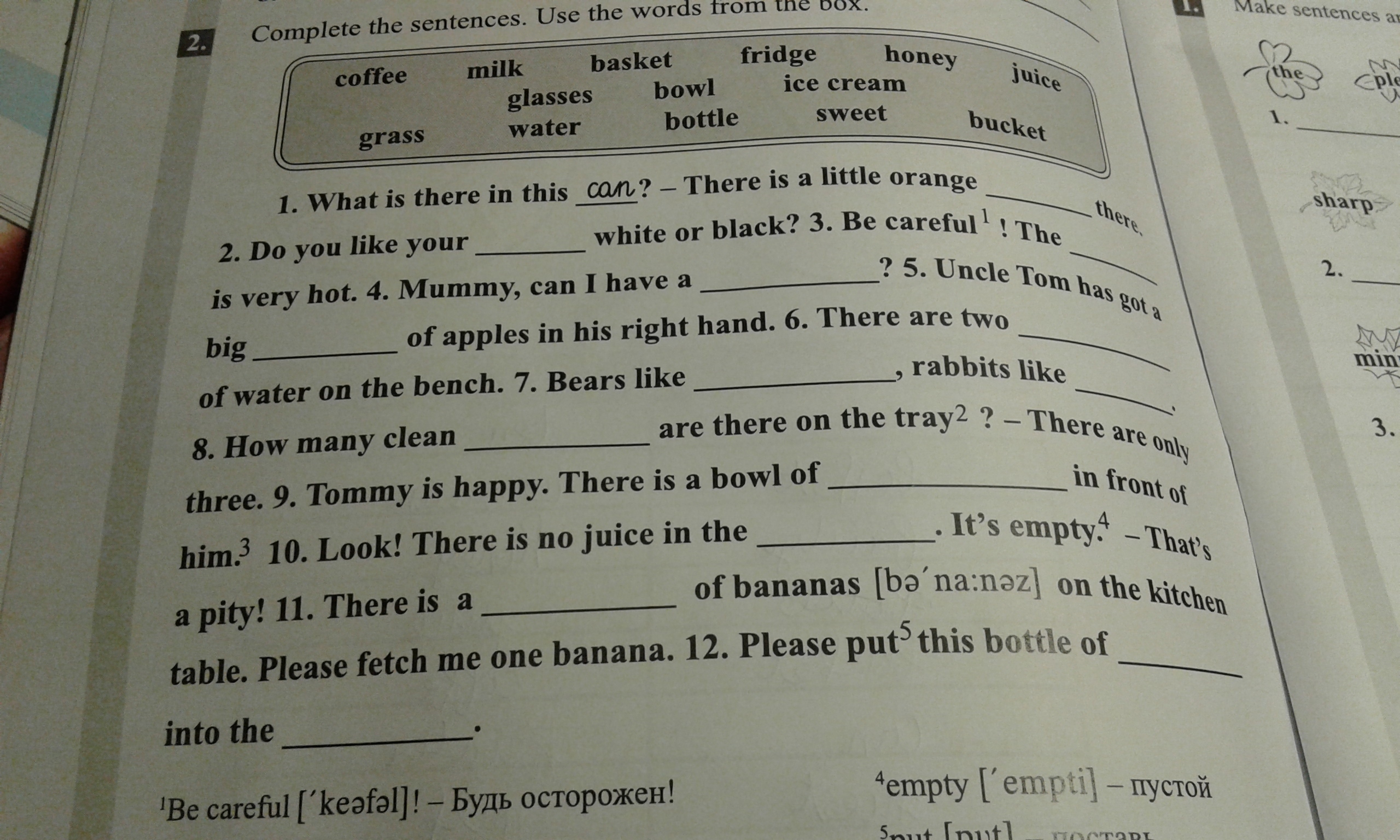 1 juice 2 coffee 3 milk 4 sweet 5 basket 6 bottles 7 honey grass 8 glasses 9 ice cream 10 fridge