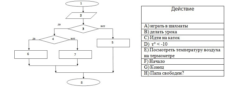 Соотнесите действия, записанные в таблице с цифрами, указанными в блок-схеме алгоритма.