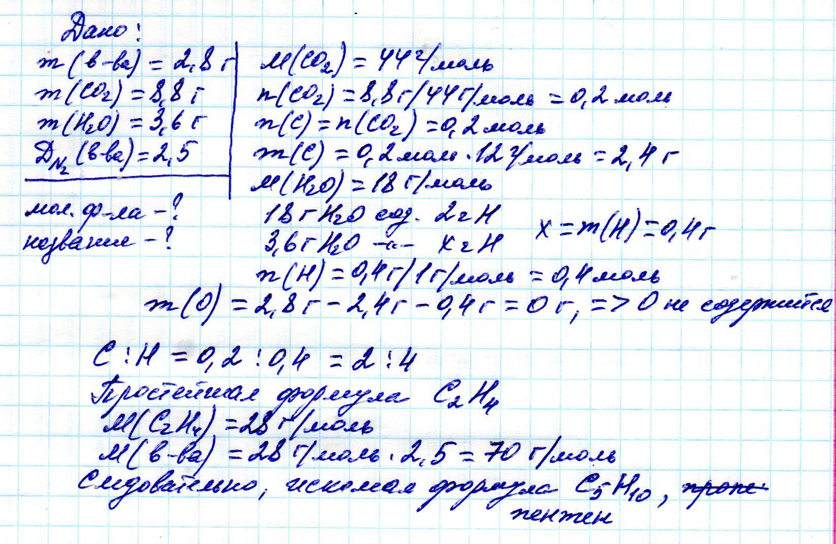 При сгорании органического вещества массой 2,8 г получили углекислый газ массой 8,8 г и воду массой 3,6 г. Относительная плотность данного вещества по АЗОТУ равна 2,5. Определите молекулярную формулу вещества и назовите его!!! Пожалуйста!!!! Срочно!