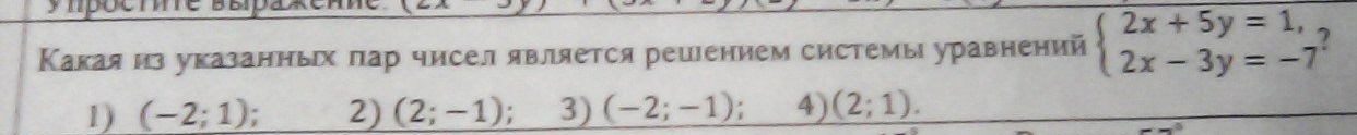 2x=1-5y; подставляем во второе уравнение: 1-5y-3y= -7; -5y-3y= -7-1; -8y= -8; y=(-8)/(-8)=1. 2x=1-5*1; 2x= 1-5; 2x= -4, x=(-4)/2= -2. Ответ: (-2:1), из указанных пар чисел решением системы является пара под цифрой 1.