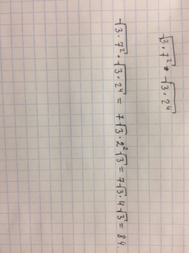 7^2 выносится просто как 7, а 2^4 как 2^2 т.е. 4. Корень из 3* корень из 3 = 3. И всё перемножается