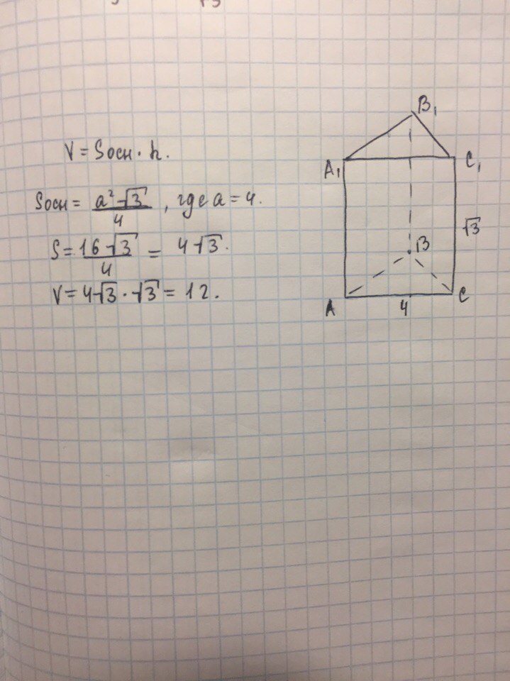 дана правильная треугольная призма, сторона основания которой 4, а боковое ребро корень из 3. найти объём призмы.