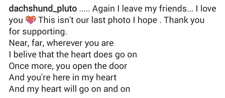 Снова я оставлю своих друзей ... Я люблю тебя. Это не наша последняя фотография, я надеюсь. Благодарим вас за поддержку. Рядом, далеко, где бы вы ни были, я верю, что сердце продолжается. Еще раз, вы открываете дверь. И вы здесь, в моем сердце. И мое сердце будет продолжаться.