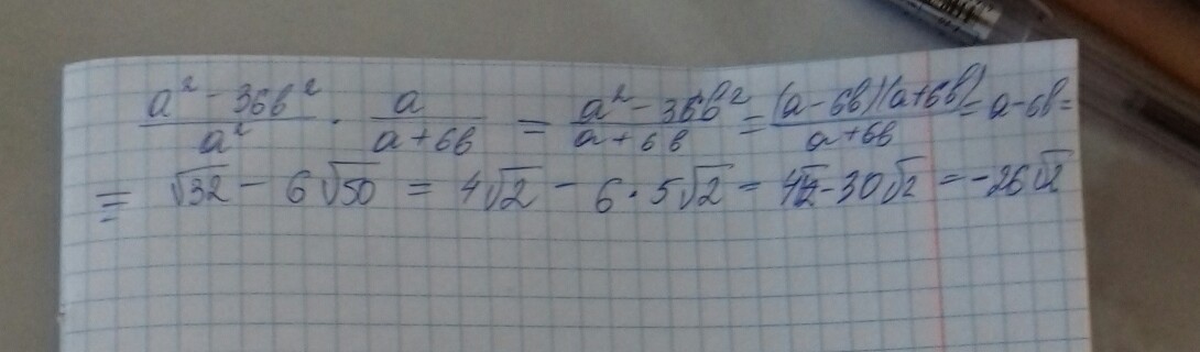 Упростите выражение а2-36б2/a2 * a/a+6b , найдите его значение при a=корень из 32, b= корень из 50