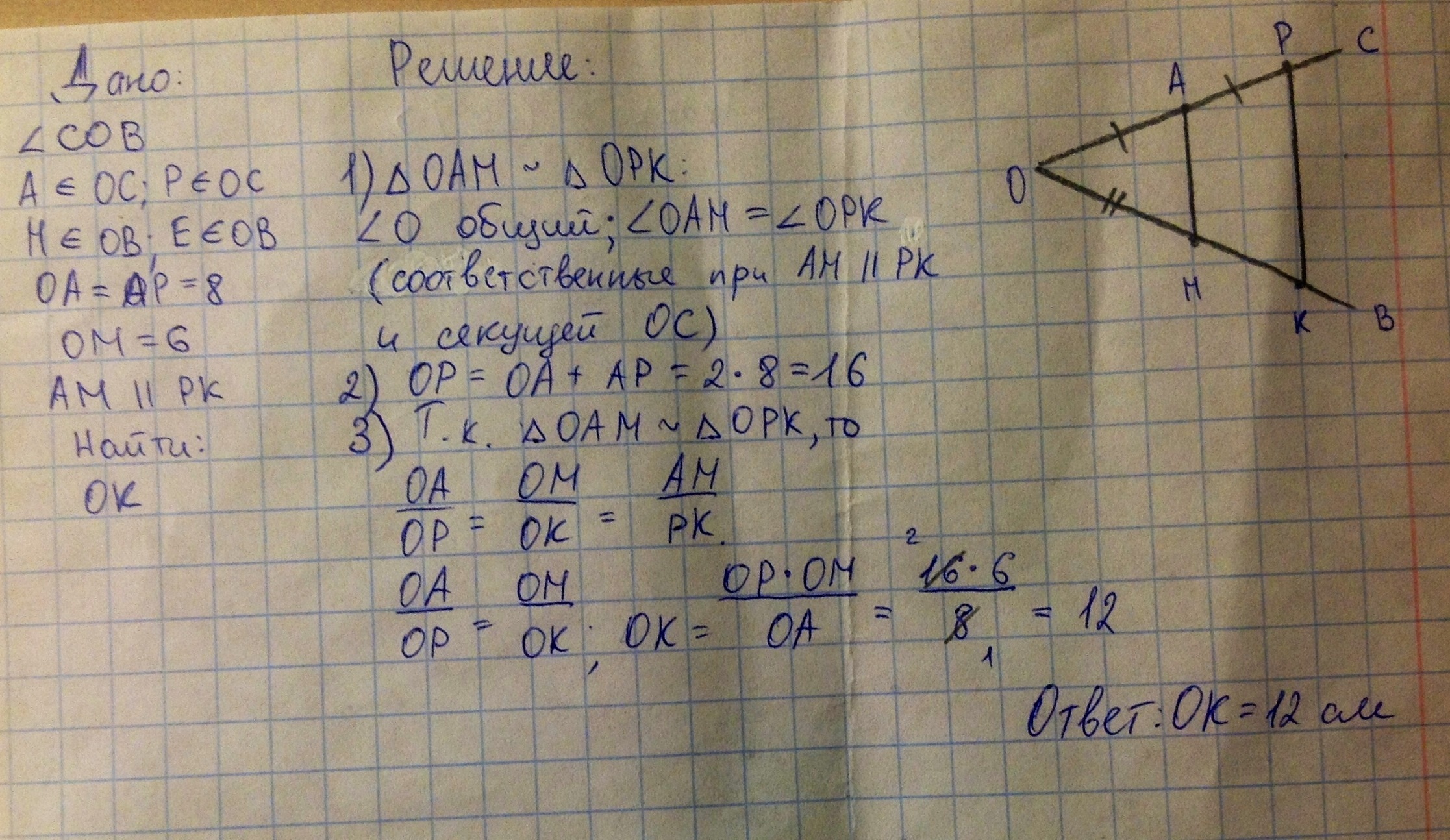 на стороне ОС угла СОВ выбраны точки Аи Р , а на стороне ОВ - точки Ми Е так,что АМ паралельно РК. найдите длину отрезна ОК если ОА=АР=8, а ОМ=6
