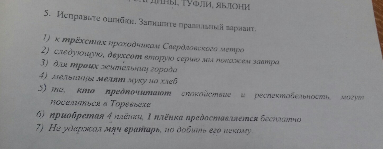 1)к трехстам 2)двухсот 3)троих 4)мелют 5) кто предпочитает 6) приобретая 1 пленка предоставляется 7)мяч вратарь