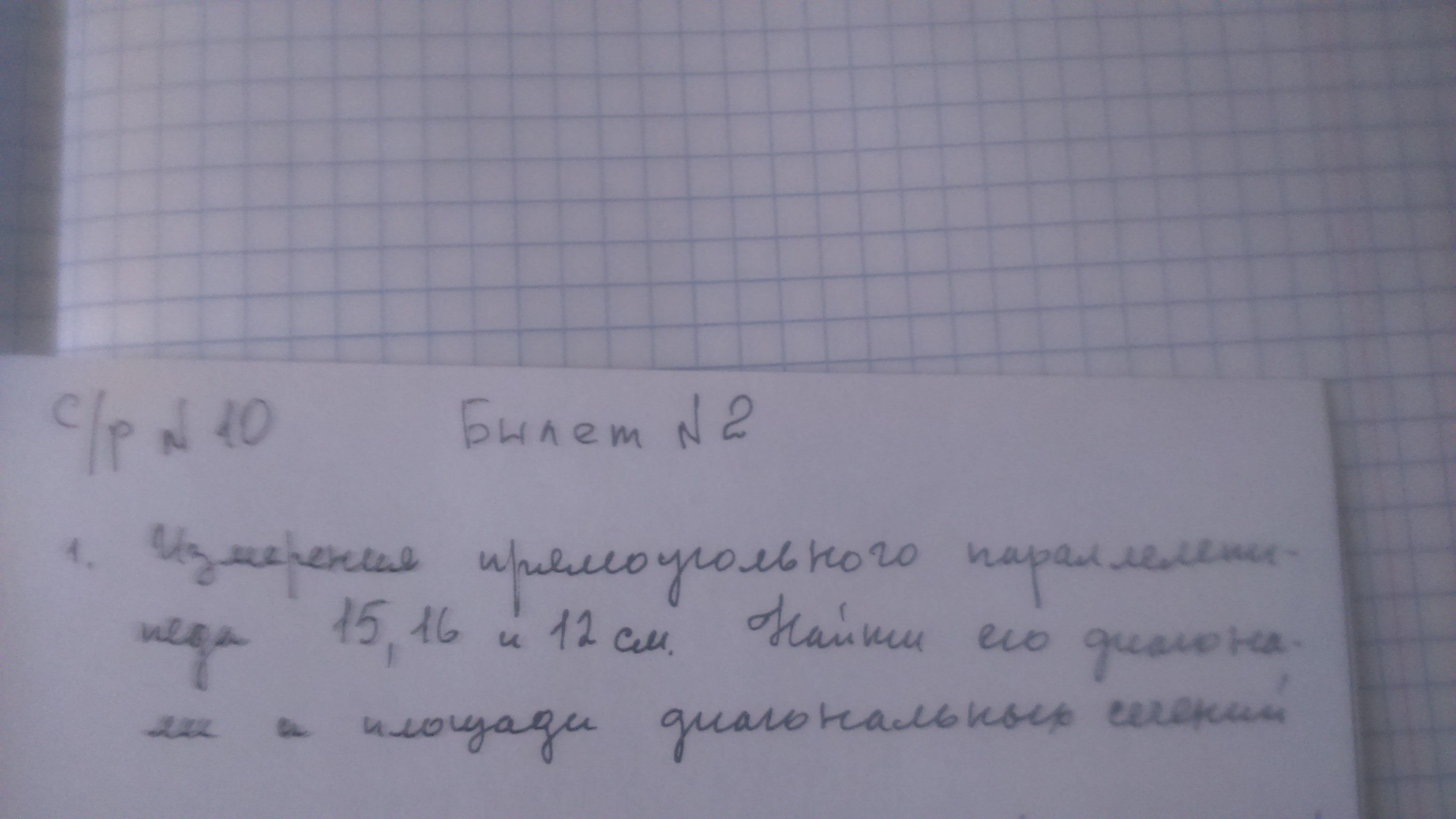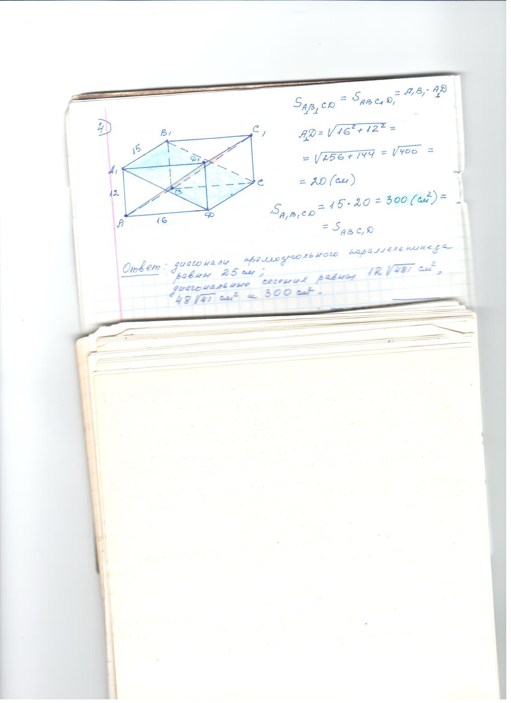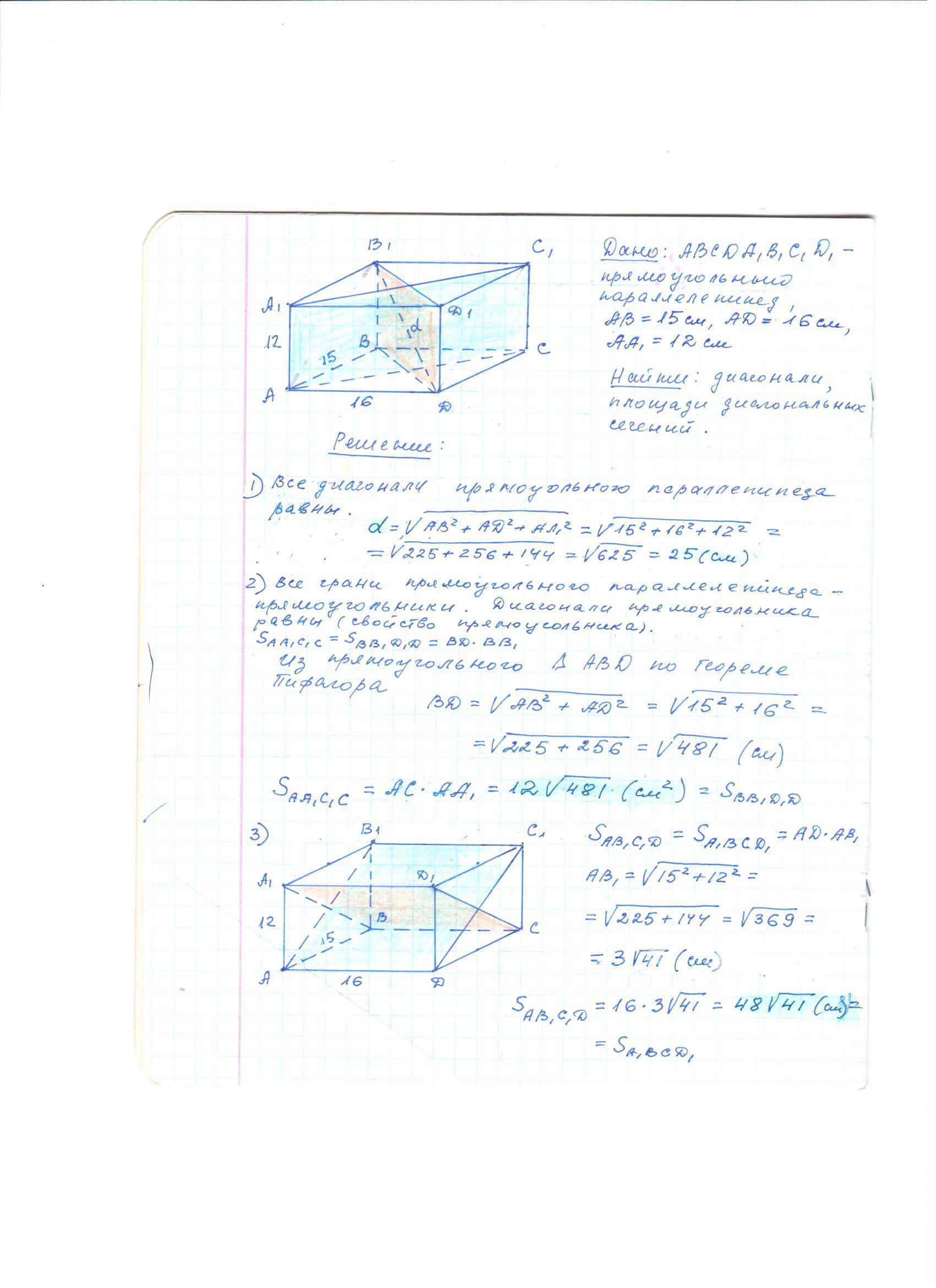 Измерение прямоугольного параллелепипеда 15,16 и 12 см. Найдите его диагонали и площади диагональных сечений.