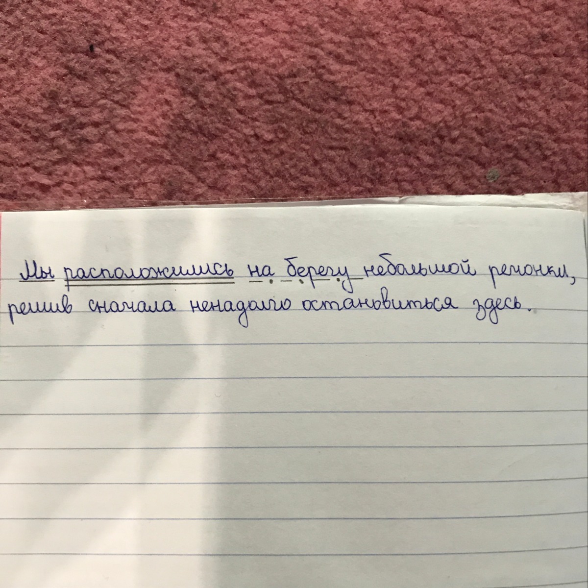 Мы(подлеж- местоим.) расположились (сказ.- глагол) на (предлог) берегу( обстоят.-существ.) небольшой (определ. - прилаг.) речонки (определ.- существ.) , решив сначала ненадолго остановиться здесь( обстоятельство)