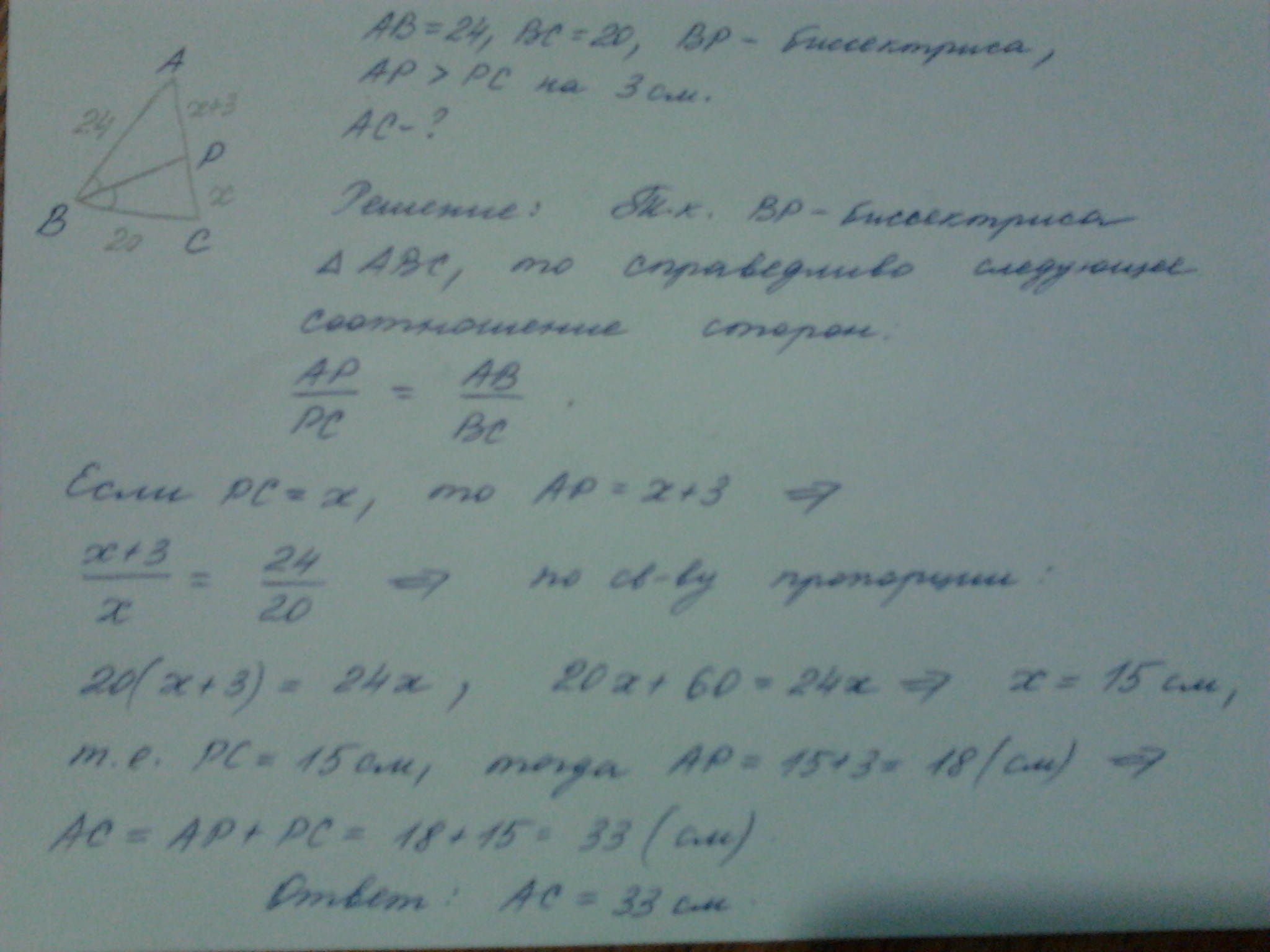 Отрезок BP- биссектриса в треугольнике АВС. АВ=24 см, ВС=20 см. Отрезок AP на 3 см больше отрезка CP. Найти сторону АС.