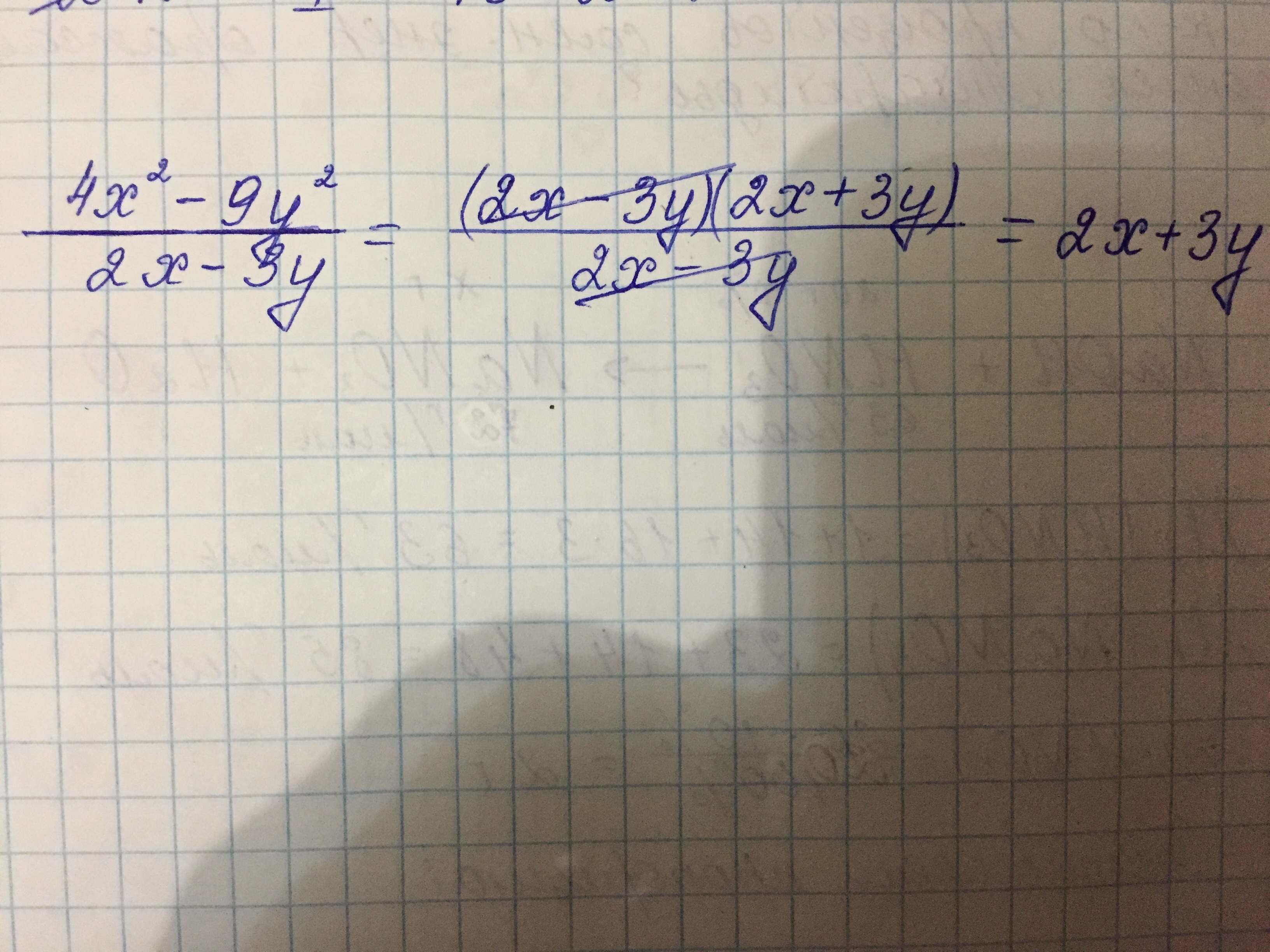 (4х²-9у²)/(2х-3у) = ((2х)²-(3у)²)/(2х-3у) = ((2х-3у)(2х+3у))/(2х-3у) = 2х+3у