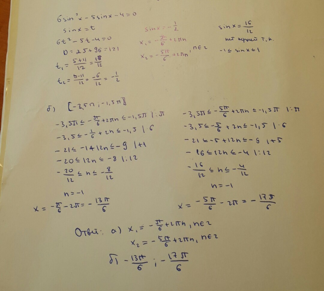 пожалуйста , решите уравнение : 6sin²x - 5sinx - 4 = 0