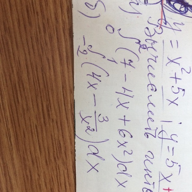 displaystyle  intlimits^2_0 {(7-4x+6x^2)} , dx =(7x-2x^2+2x^3)|^2_0=14-8+16=22\ \ \ intlimits^1_{-2} {bigg(4x- frac{3}{x^2}bigg) } , dx =bigg(2x^2+ frac{3}{x}bigg)bigg|^1_{-2}= -1.5