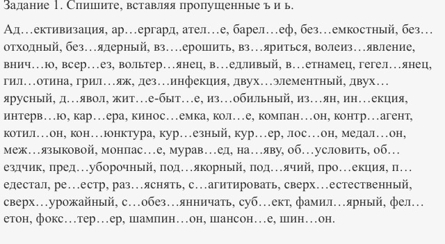 Адъективизация,арьергард,ателье,барельеф,безъемкостный,безотходный,безъядерный,взъерошенный,взъяриться,волеизъявление,вничью,всерьез, вольтерьянец,въедливый,вьетнамец,гегельянец,гильотина,грильяж,дезинфекция,двухэлементный, двухъярусный,дьявол,житье-бытье,изобильный,изъян,инъекция,интервью,карьера,киносъемка,колье,компаньон,контрагент,котильон,конъюнктура,курьезный,курьер,лосьон,медальон,межъязыковой,монпансье,муравьед,наяву,обусловить,объездчик,предуборочный,подъякорный,подьячий,проекция,пьедестал,реестр,разъяснить,сагитировать,сверхъестественный,сверхурожайный,с обезьянничать,субъект, фамильярный,фельетон,фокстерьер,шампиньон,шансонье,шиньон.
