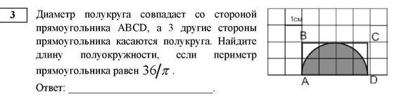 периметр пямоугольника ( А+В) х 2 =12 , 36/П=12 , П=36:12=3 Длина окружности 2ПиЭр, длина полуогружноти ПиЭр = 3 х 2= 6