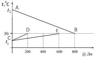 На рисунке графически изображён процесс теплообмена для случая, когда нагретый до t2 °С металлический брусок опускают в медный калориметр, содержащий воду при температуре t1.