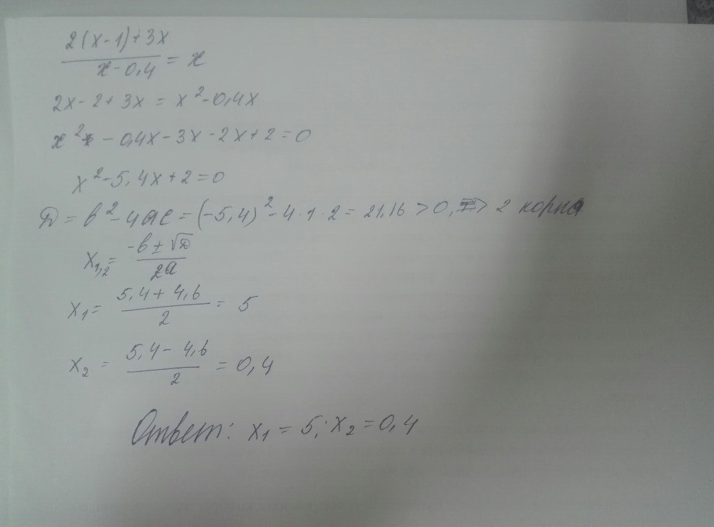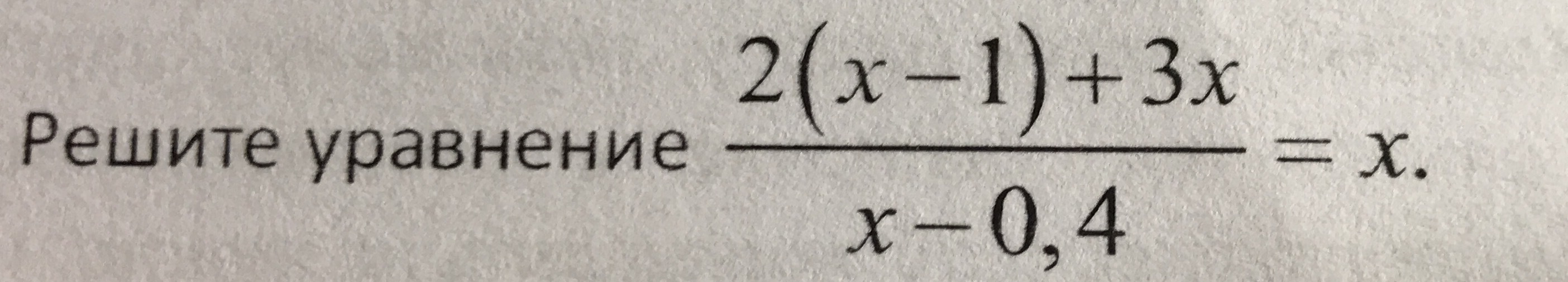 (2(x-1)+3x)/(x-0,4) = x, x≠0,4