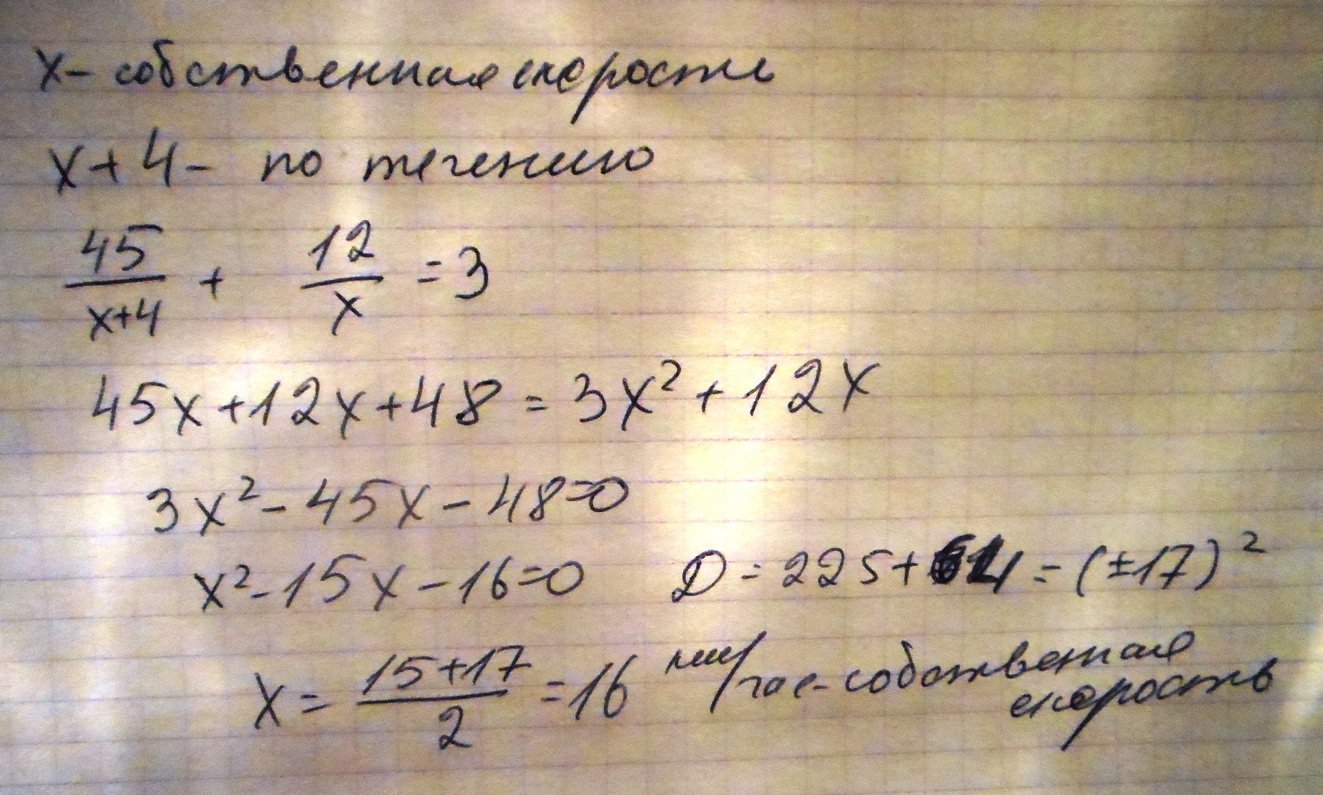 Нехай власна швидкість катера х кмгод, тоді швидкість за течією х+4 кмгод. За течією катер плив 45(х+4) год, по озеру він плив 12х год. Маємо рівняння: