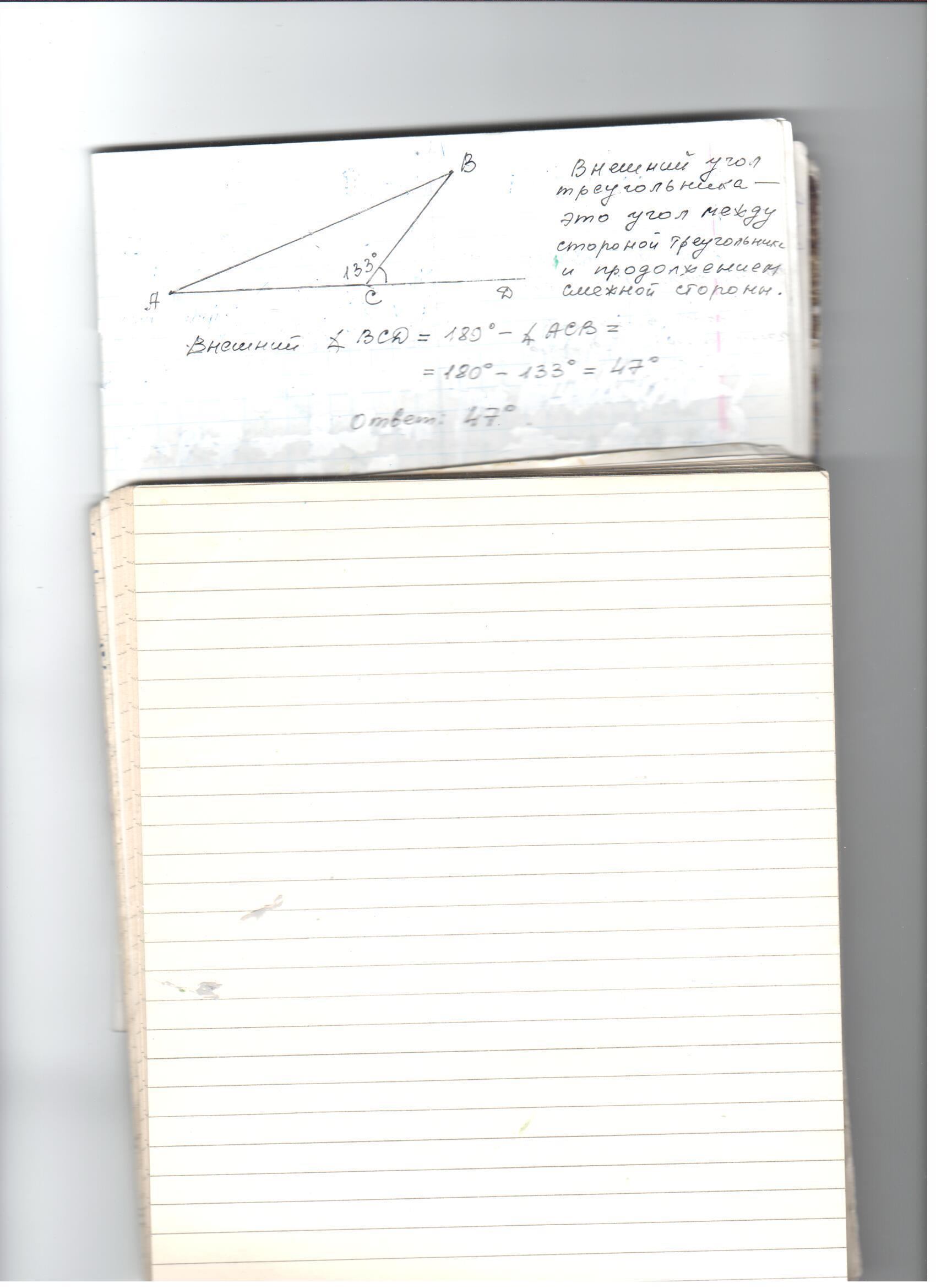 В треугольнике ABC угол C равен 133°. Найдите внешний угол при вершине C. Ответ дайте в градусах.