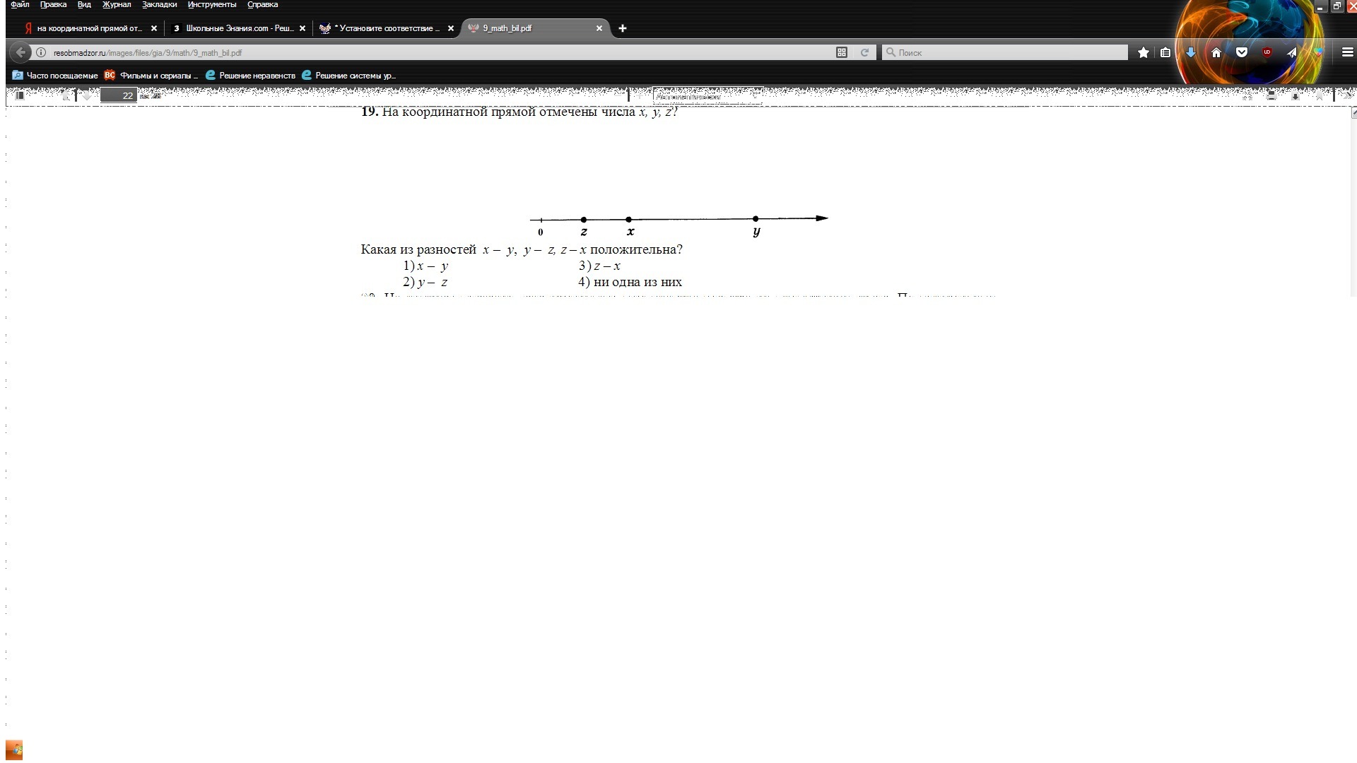 На координатной прямой отмечены числа,x,y,z. какая из разностей x-y, y-z, z-x положительна? 1) x-y 2)y-z 3)z-x 4) ни одна из ни. срочно надо, пожалуйста помогите