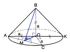 Примем радиус и высоту конуса равными а. Высота ВО конуса перпендикулярна основанию, следовательно, перпендикулярна любой прямой, проходящей в плоскости основания через О .