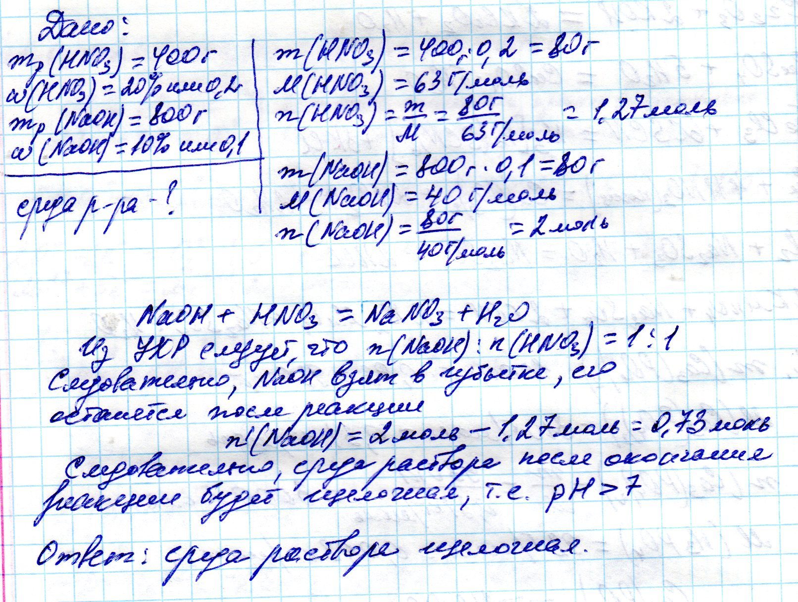 400 г 20% раствора азотной кислоты взаимодействие с 800 г 10% раствора гидроксида натрия Среда раствора посли окончания реакции
