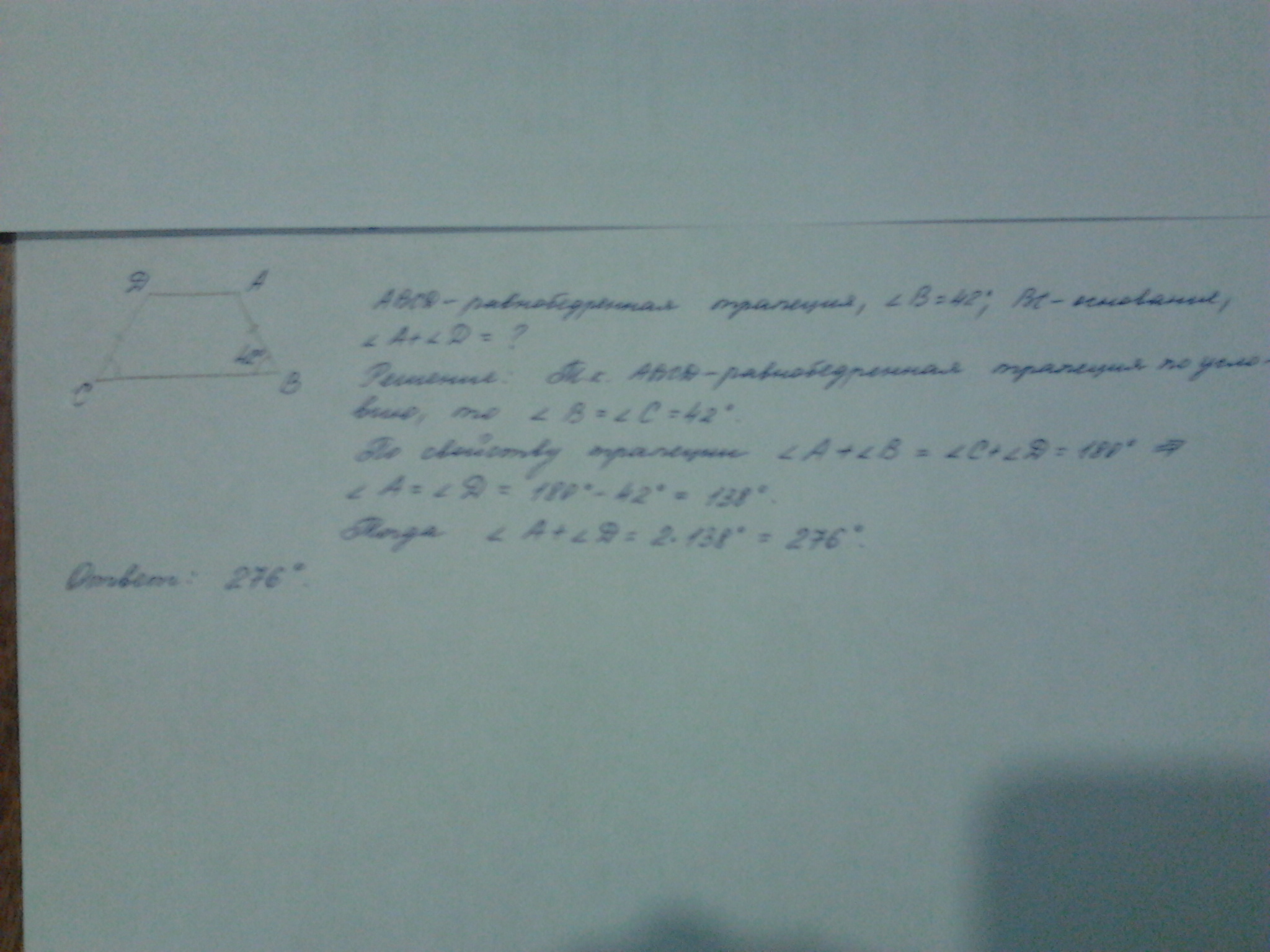 Угол В при основании ВС равнобедренной трапеции ABCD равен 42 градуса. Найдите сумму углов А и D. Ответ дайте в градусах.