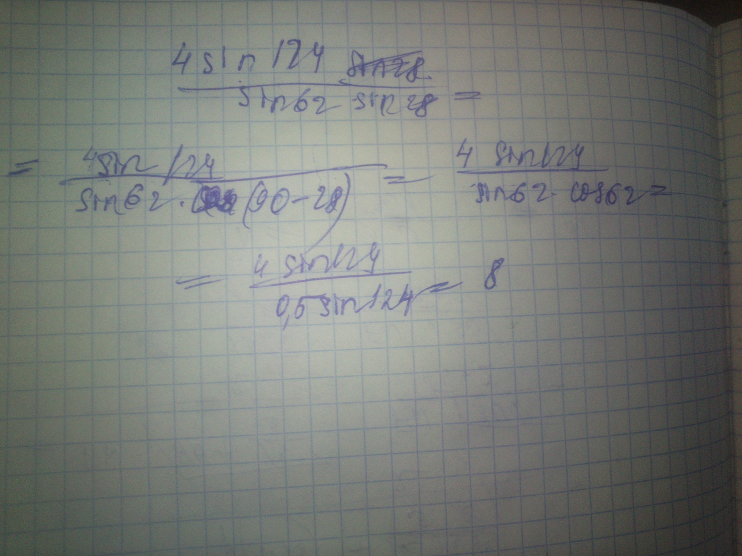 числитель = 4Sin124° = 4*2Sin62°Cos62 °(сработала формула синуса двойного угла)