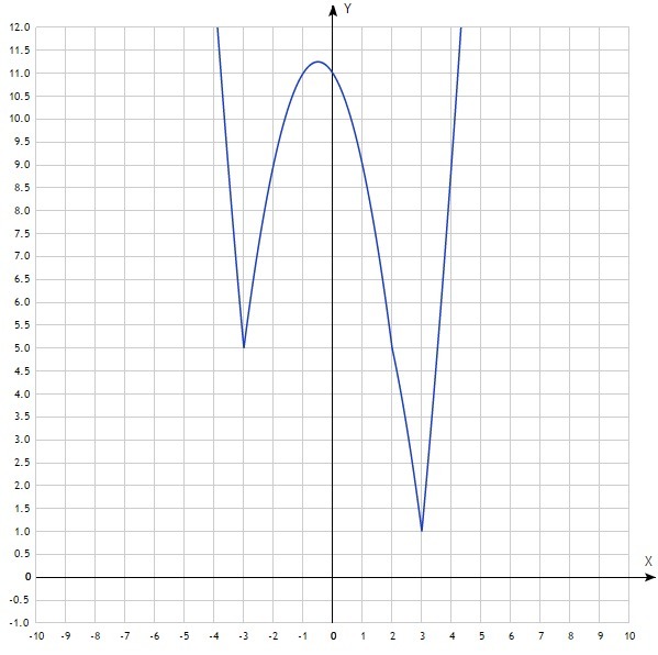 x0 = -1/2 => y0 = |-1/2-2|+|(-1/2)^2-9|=5/2+35/4=45/4=11.25